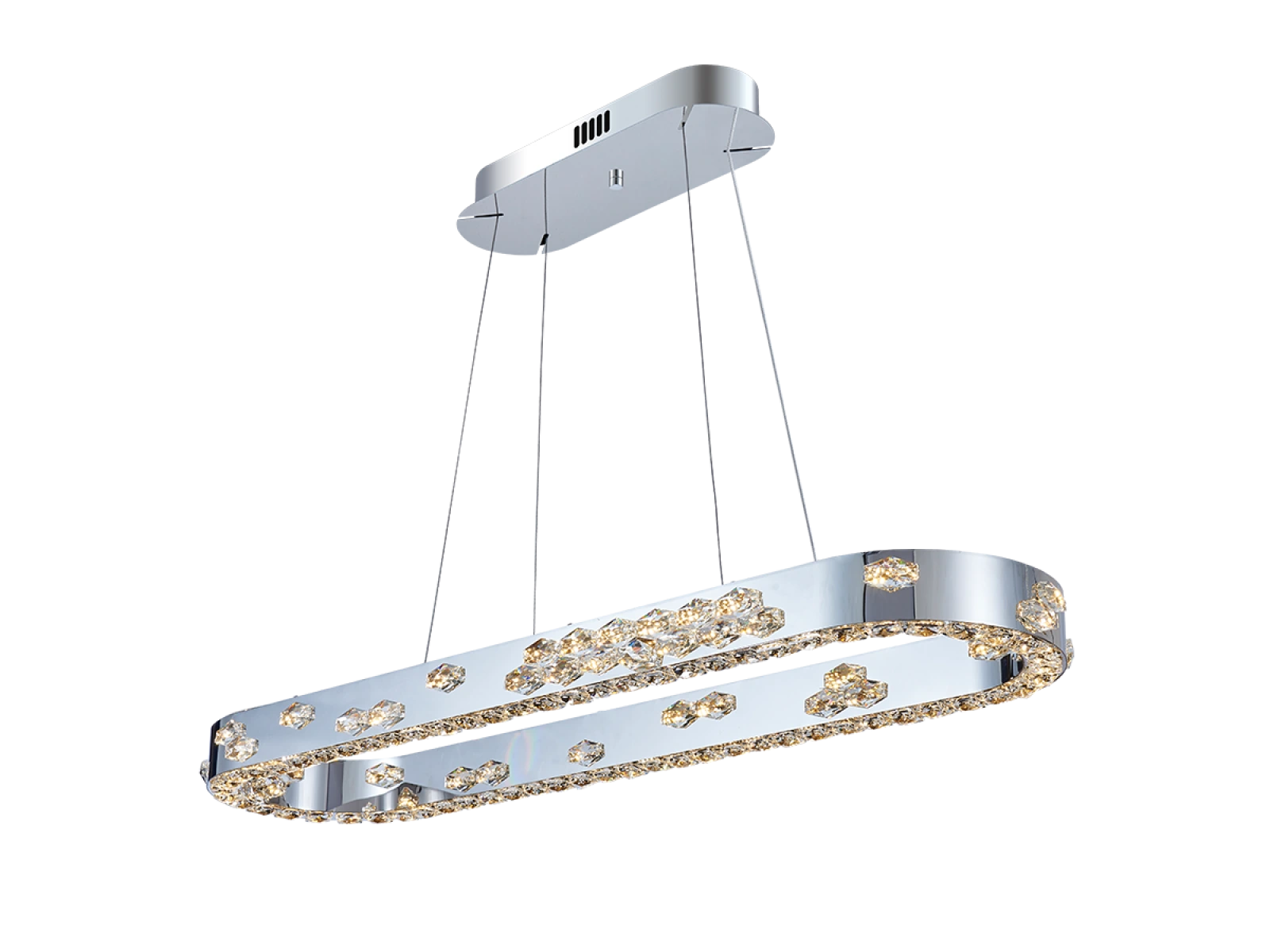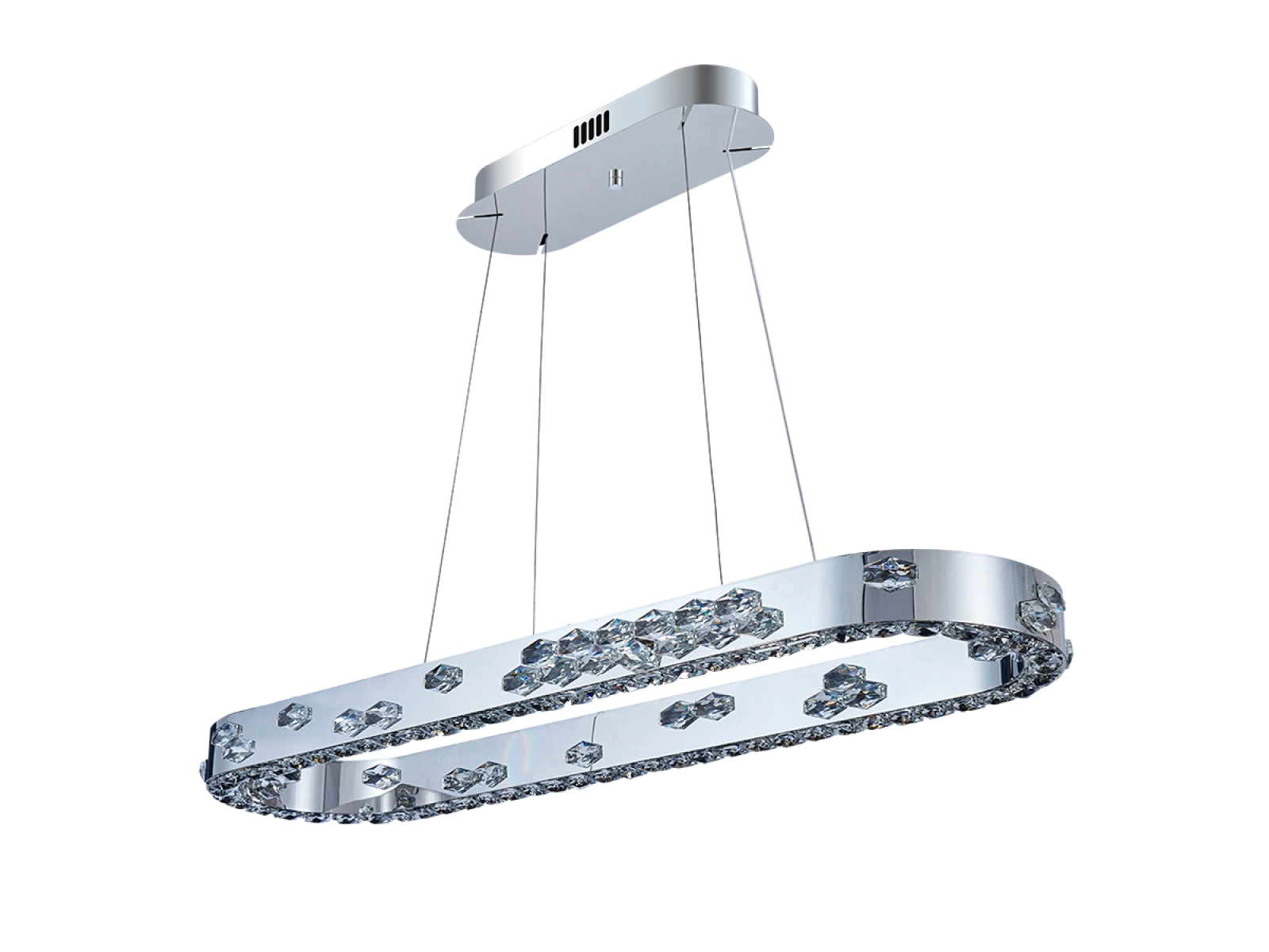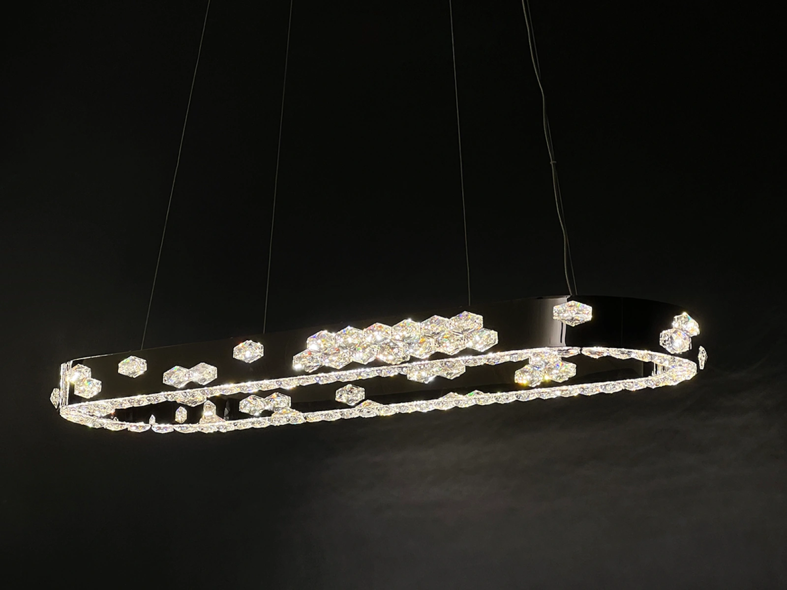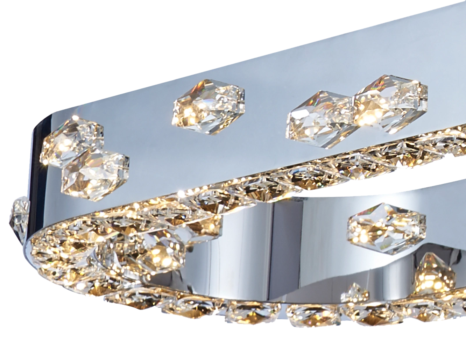 Oprawa wykonana jest z wytrzymałego metalu ze stali nierdzewnej z chromowanym wykończeniem, a jej projekt uzupełniają precyzyjnie wycięte kryształy, które promują odbicie i załamanie światła. Technologia obróbki gwarantuje stabilność materiału i zachowanie właściwości estetycznych.