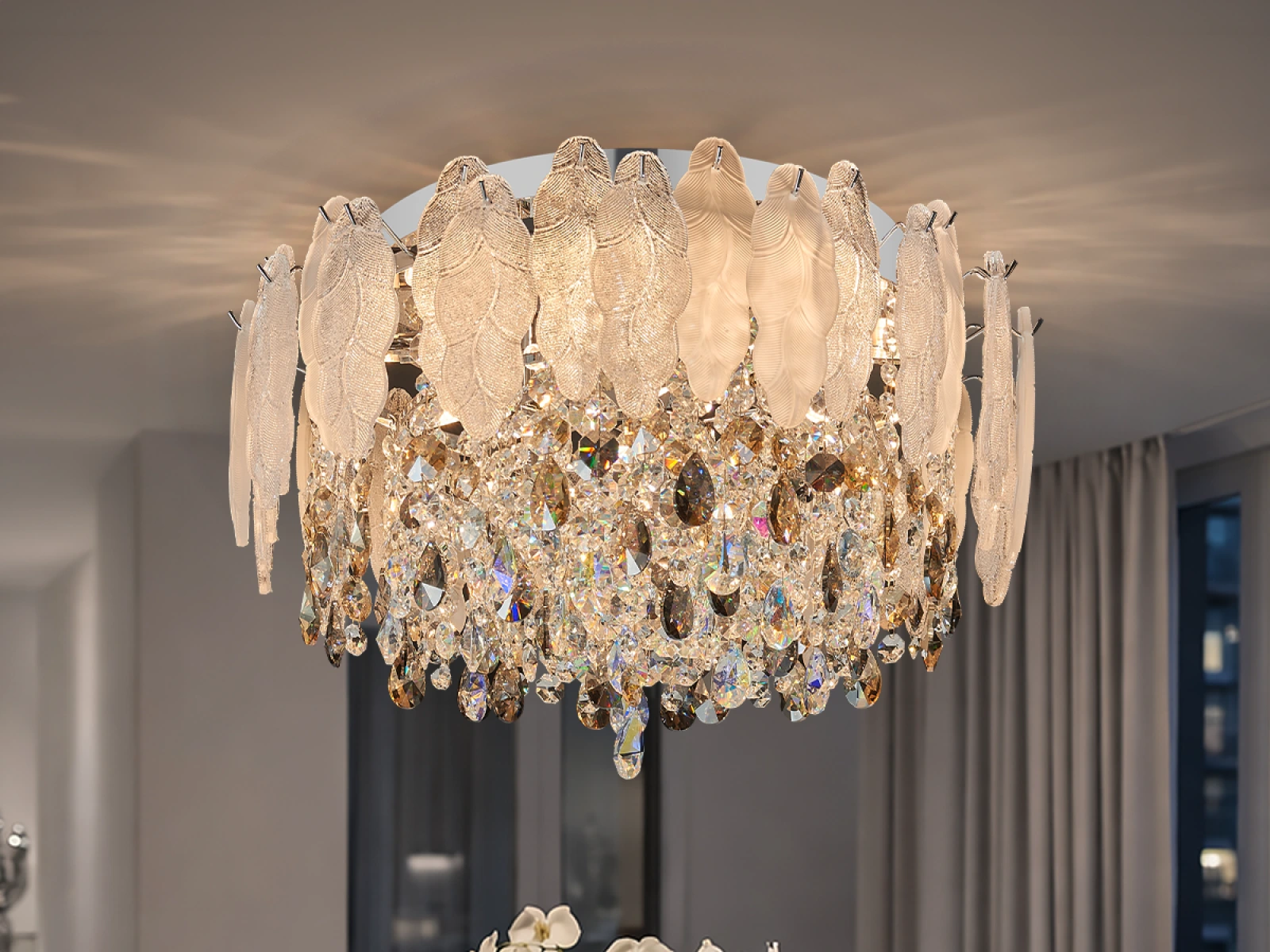 Lampa sufitowa GURU marki VIZARDI to harmonijne połączenie elegancji, subtelnego luksusu i nowoczesnego designu. Dzięki swojemu charakterystycznemu, a zarazem wyważonemu wyglądowi, naturalnie komponuje się w salonach, jadalniach, sypialniach i przestrzeniach reprezentacyjnych, gdzie tworzy przyjazną i stylową atmosferę.