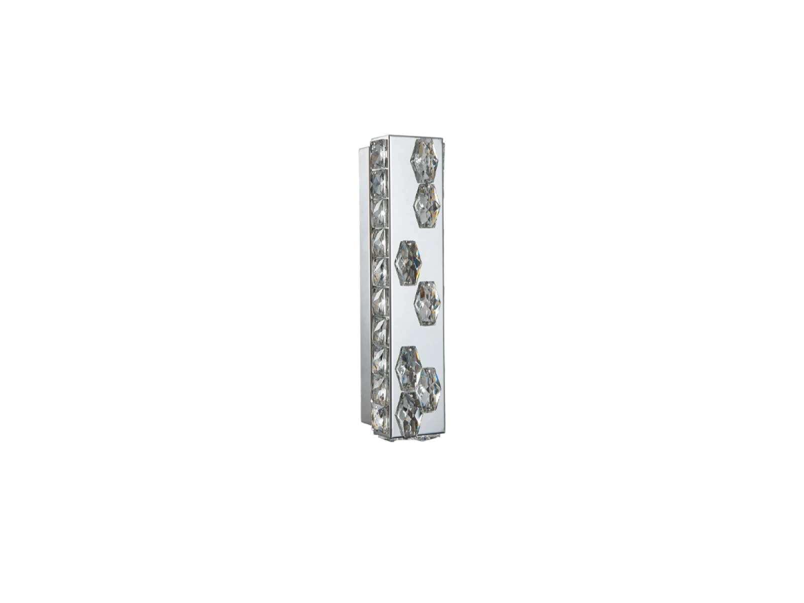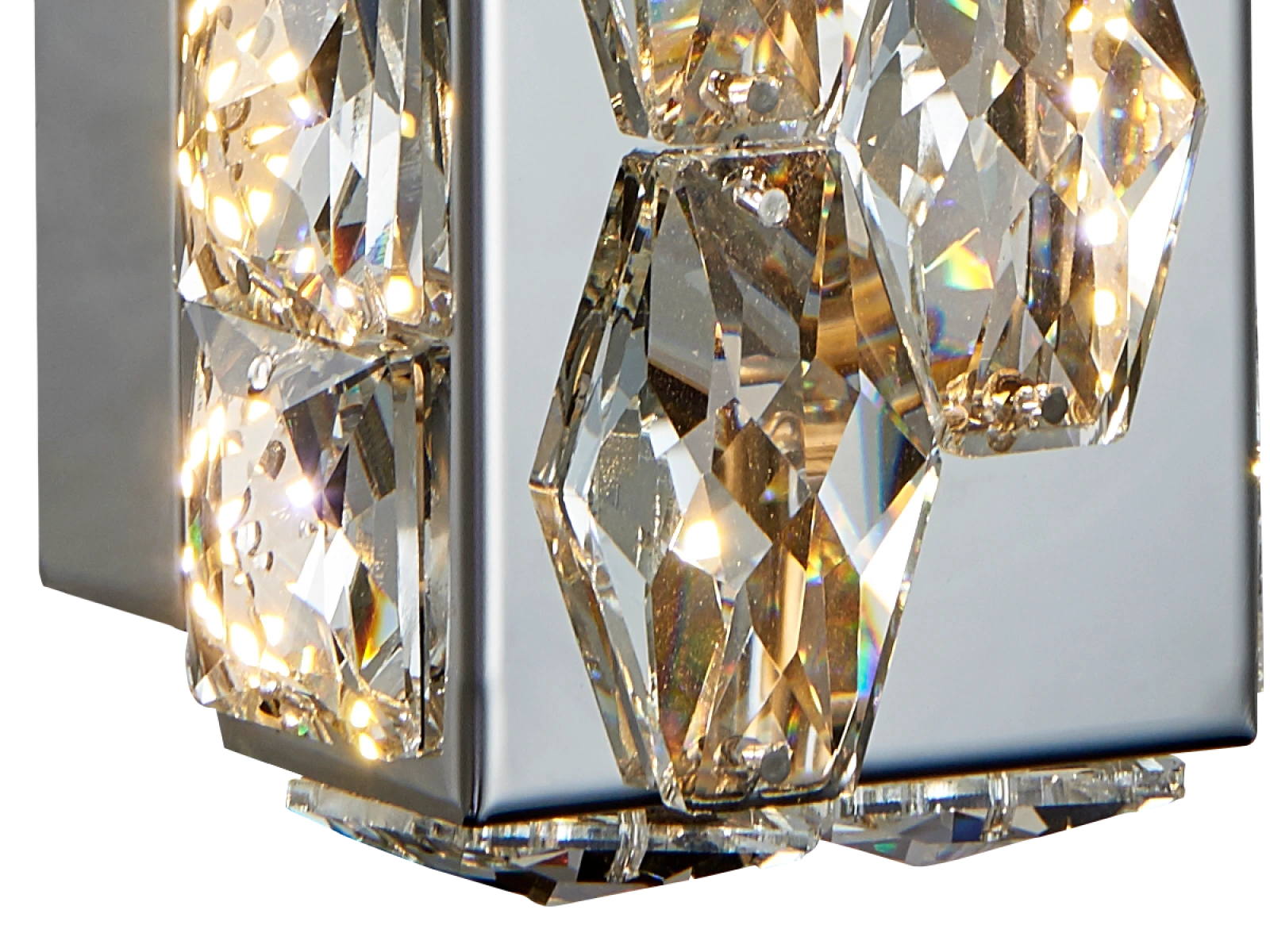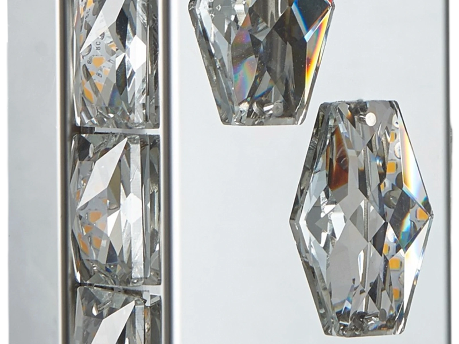 Oprawa wykonana jest z wytrzymałej stali nierdzewnej z chromowanym wykończeniem i szczegółowo wyciętymi kryształami, które podkreślają efekty świetlne. Zaawansowana obróbka materiału gwarantuje jego długotrwałą stabilność i estetykę.