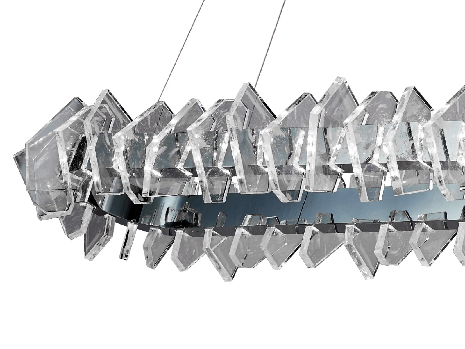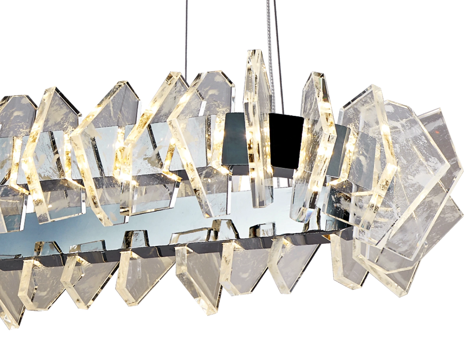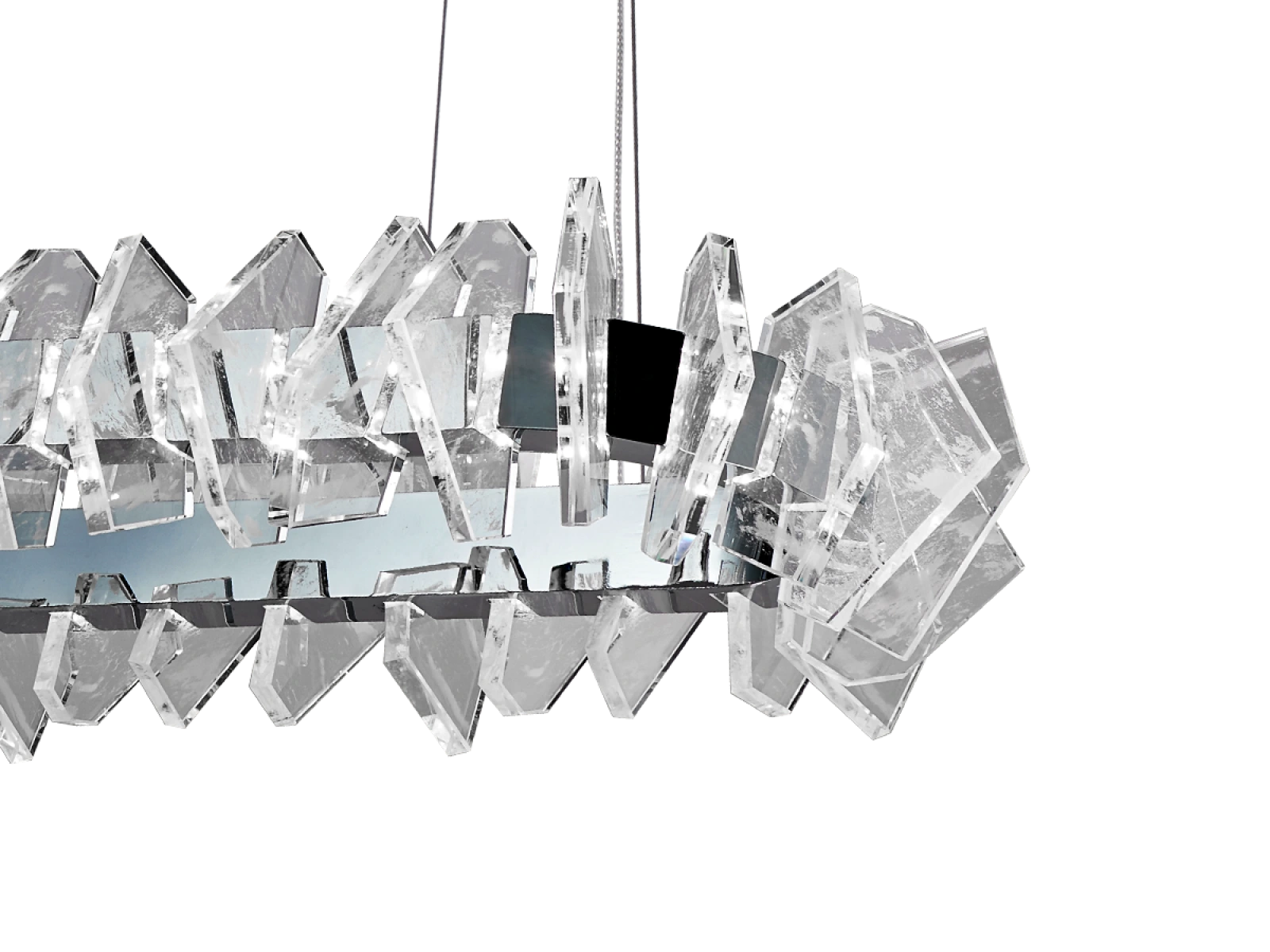 Konštrukcia je vyrobená z kvalitnej ocele s chrómovou povrchovou úpravou a doplnená o originálne usporiadané, precízne brúsené krištáľové prvky, ktoré zabezpečujú intenzívny lom a odraz svetla. Výsledkom je luxusná svetelná atmosféra s výrazným dekoratívnym efektom, ktorá podčiarkne charakter moderného aj reprezentatívneho interiéru.