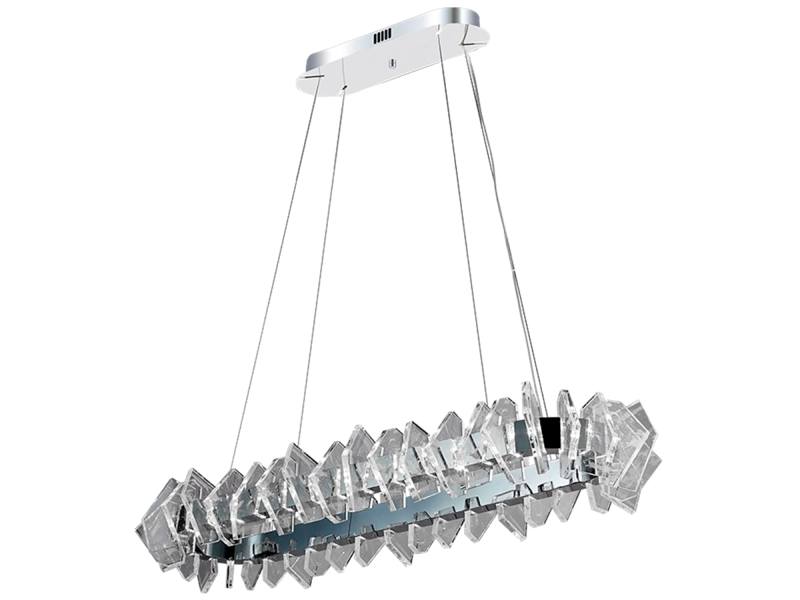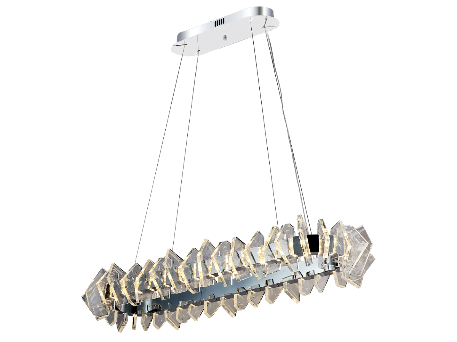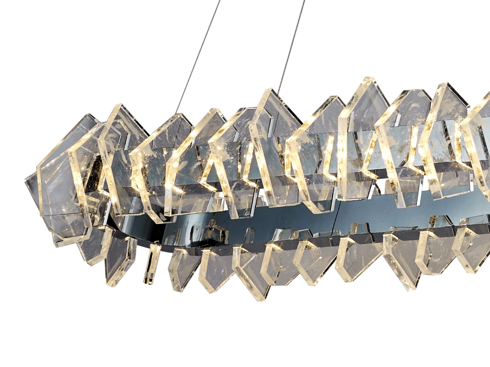 Konštrukcia je vyrobená z kvalitnej ocele s chrómovou povrchovou úpravou a doplnená o originálne usporiadané, precízne brúsené krištáľové prvky, ktoré zabezpečujú intenzívny lom a odraz svetla. Výsledkom je luxusná svetelná atmosféra s výrazným dekoratívnym efektom, ktorá podčiarkne charakter moderného aj reprezentatívneho interiéru.